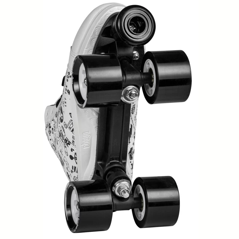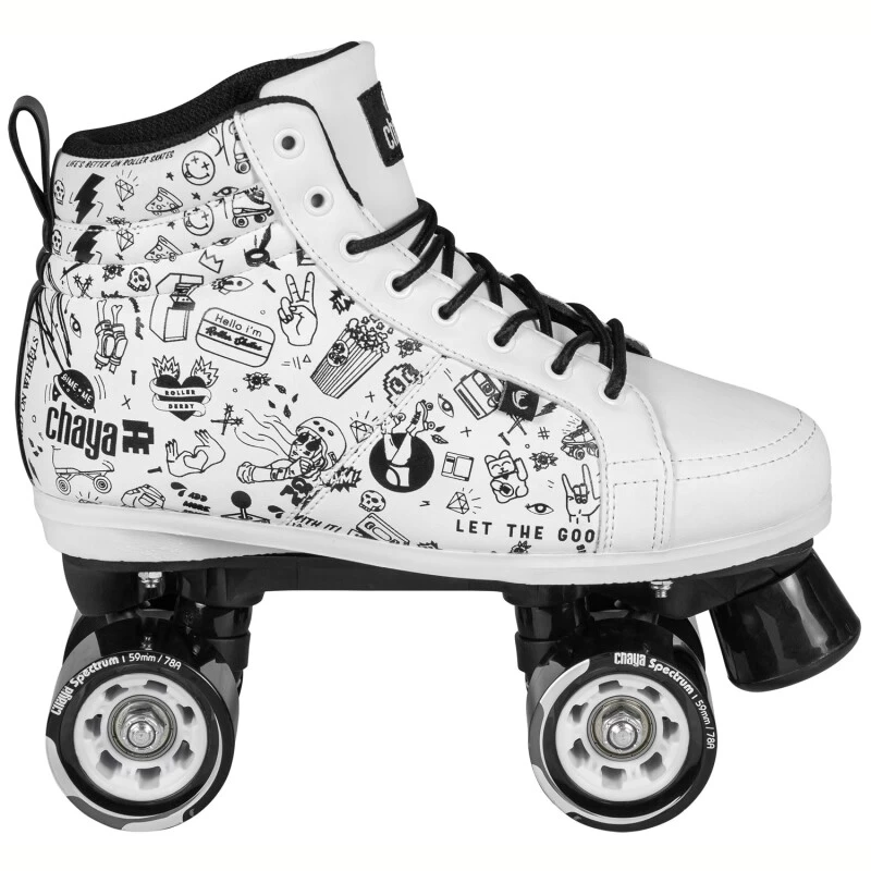 Der Chaya Sketch ist eines der coolsten Skatesdesigns, das dich in die Anfangszeit des Rollerskatens zurückversetzt! Die schwarz-weiß Skizzen auf dem Schuh zeigen einen bunten Themenmix aus Skate Fun, Roller Derby, GRL PWR und vielem mehr. Der mittelhoch geschnittene Boot punktet mit Komfort und gutem Support dank der Soft-Touch-Polsterung sowie einer EVA-Innensohle. Mit Hilfe von 59mm / 78A Spectrum Outdoor Rollen und Wicked ABEC 7 Kugellagern genießt du ein ruhiges und entspanntes Rollerlebnis in der Roller Disco, auf der Straße oder beim Cruisen am Strand.