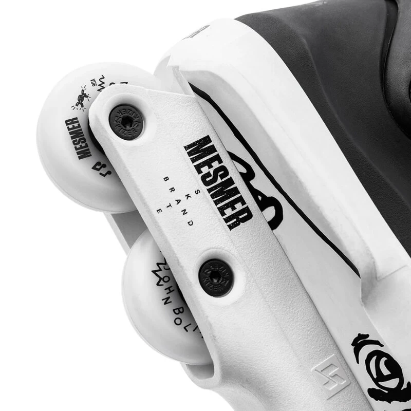 Die Wiederbelebung eines verloren geglaubten Schuhs. Mit dem Throne John Bolino führt Mesmer eine aktualisierte Version des klassischen Throne-Boots wieder ein, komplett mit erhöhter Ferse, einer komplett neu gestalteten einteiligen Souleplate und einem brandneuen modifizierten Cuff. Dank dieser Verbesserungen und der Verwendung von PEBAX, einem Wundermaterial, das für Hochleistungssportbekleidung entwickelt wurde und zwei verschiedene chemische Stoffe (Polyether und Polyamid) auf demselben Grundgerüst vereint, wobei die Leistungseigenschaften beider Stoffe erhalten bleiben, sind die Spezifikationen dieser Aggressiv Skates alles andere als altmodisch. Eine weitere Branchenneuheit sind die einteiligen Souleplates mit aufgedruckten Künstler-Kollaborationen auf der Unterseite. Der Komfort wird durch den Mesmer Slayer Innenschuh von MYFIT garantiert. Ein einfaches, fast nahtloses Design zusammen mit Memory Foam-Polsterung und Mikrofaser-Futter reduziert Druckstellen, während die individuell bedruckten Dual-Density-Sohlen und PU-Dämpfer das Skate-Gefühl abrunden.
