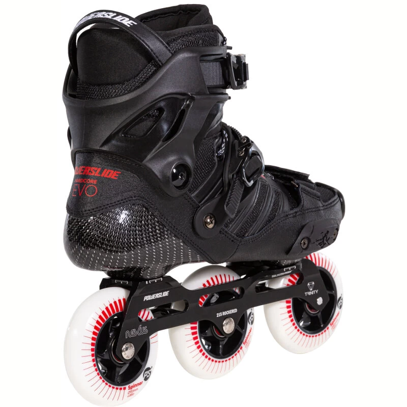 In der dritten Generation HC Evo verpasst Powerslide dem Topmodell der Urban-Freeskate-Kollektion leichte optische und technische Änderungen. Wobei das Grundkonzept bestehen bleibt und der Skate als HC Evo zu erkennen bleibt: Zu der leichten, steifen und wärmeverformbaren Karbonschale mit Klettverschluß über den Zehen gestellt sich die Nexus 3×90 Trinity Schiene (Rocker) und Powerslide Spinner Wheels.