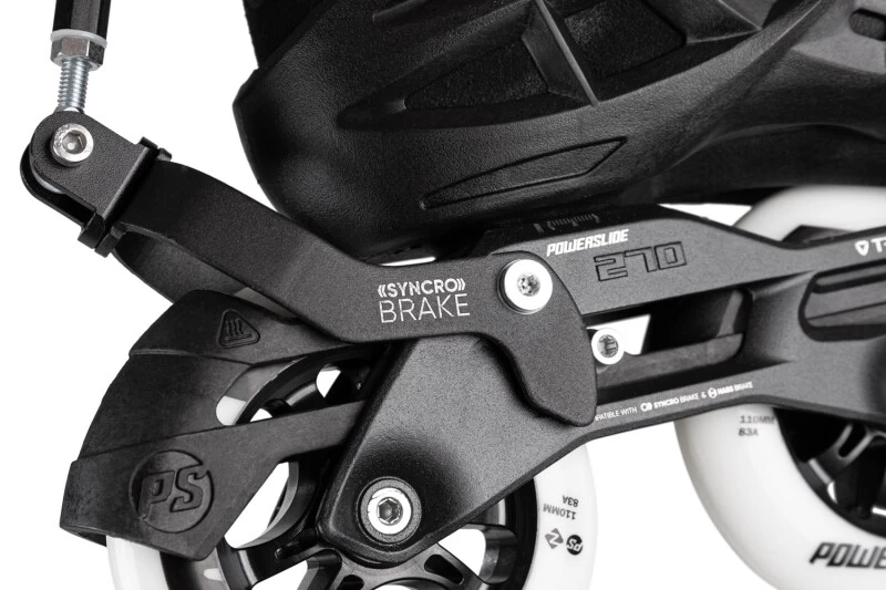 Der Zusatz SYNCRO deutet auf die Besonderheit dieses Powerslide Phuzion Argon Modells hin. Hinter der Bezeichnung steckt das neue Bremssystem von Powerslide, das das Bremsen nicht nur einfacher, sondern auch sicherer und effektiver macht. Einfacher, weil man den Fuß nicht anheben muss um zu bremsen – was gleichzeitig die Sicherheit erhöht. Und effektiver weil die Rollen gebremst werden – alle gleichzeitig. Realisiert wird dies durch den Bremsarm am Schaft der Skates. Schiebst du deinen Fuß nach vorne, drückt dein Beim den Schaft nach unten und der Arm lenkt die Kraft auf die Bremse, indem diese auf die Rollen geschoben wird. Gut dosierbar und vor allem super sicher, denn alle Rollen bleiben beim Bremsvorgang auf der Straße.