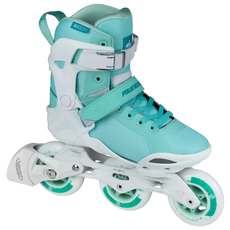 Der Powerslide Radon 90 Teal ist ein gut ausgestatteter Inlineskate für Einsteigerinnen und Hobbyskaterinnen. Drei 90mm Rollen sorgen für ein angenehmes und sicheres Fahrverhalten. Dank 3-Punkt-Verschraubung der Schiene (Trinity) ist der Schwerpunkt trotz der großen Rollen extrem tief, was die Stabilität und Balance spürbar verbssert.
