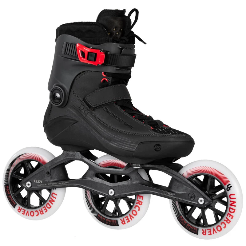 Powerslide setzt bei der Schiene auf den Dauerbrenner Elite Frame, die gegossene und leichte Magnesium Schiene in 12,5″ Länge. Diese Bauweise garantiert Laufruhe und lange Gleitphasen. Dank des Trinity Montagesystems stehst du trotz der 125mm großen Undercover Raw White Rollen samt Wicked Abec 9 Kugellagern stabil und profitierst von der breiten Auflagefläche von Schiene und Schuh. Dies reduziert die Belastung der Muskulatur und sorgt für eine bessere Kraftübertragung.