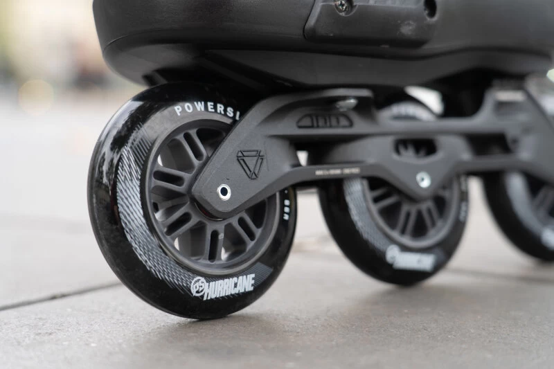 Der Zoom kam bisher mit Standardschienen in den Handel. Powerslide spendiert ihm nun ein Trinity Setup für einen tieferen Schwerpunkt und 3x100mm Rollen. Ermöglicht wird dies durch einen Adapter, der auch auf andere Skatemodelle passt. In der Aluminiumschiene sind 100mm Hurricane Rollen und Wicked Abec 7 Kugellager verbaut.