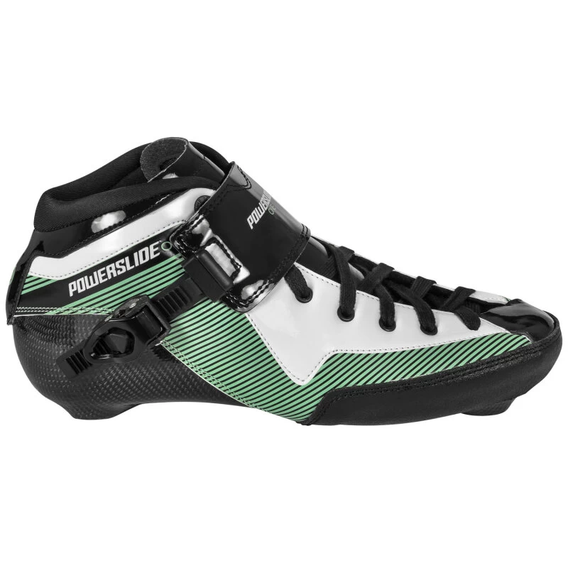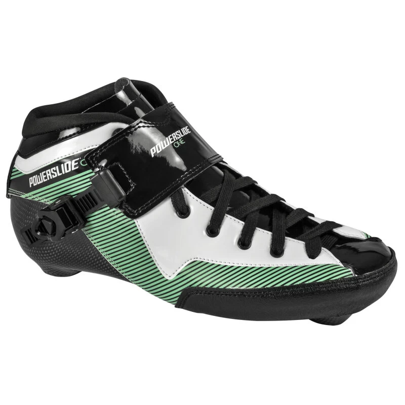Das Obermaterial ist ein Mix aus Kunstleder und Microfiber, der sich angenehm fest an den Fuß schmiegt. Beim Verschluß setzt Powerslide auf die klassische Kombination aus gewachsten Schnürsenkeln und Schnallenverschluß. So bietet der Schuh eine sportliche aber komfortable Basis für einen soliden Speedskate.
