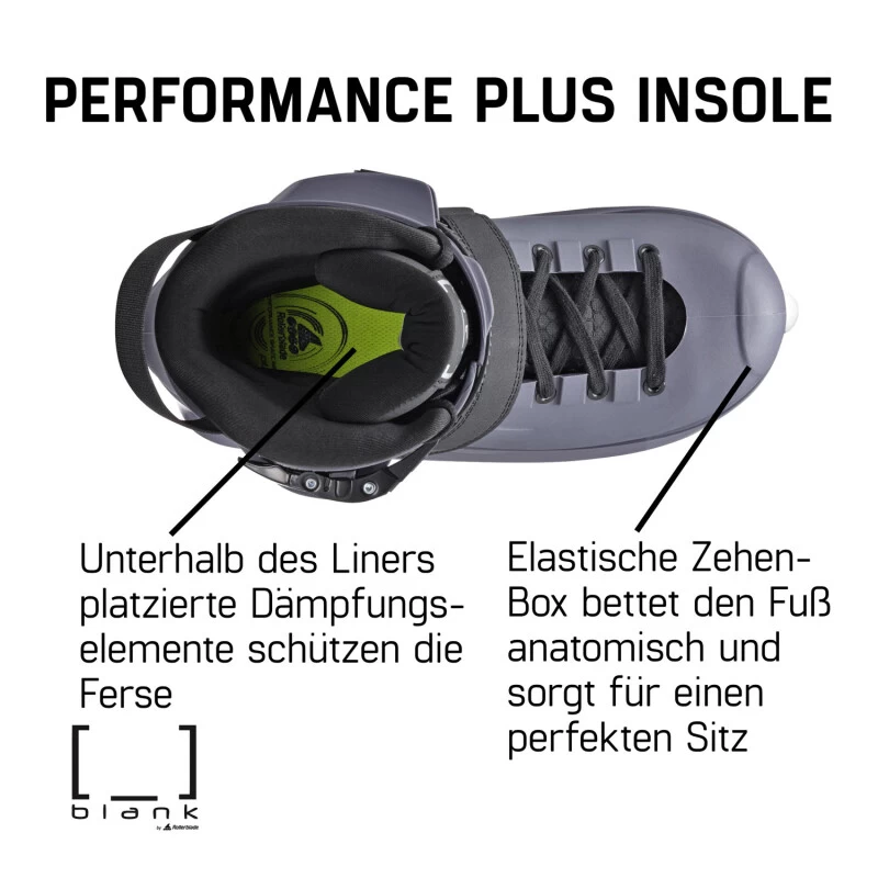 PERFORMANCE PLUS INSOLE und die elastische Zehen-Box betten den Fuß anatomisch ein und sorgt für einen perfekten Sitz. Kautschukverstärkungen an der Sohle bieten eine verbesserte Haltbarkeit, das Schnürsystem einen präzisen Halt und die Silikon Streifen an der Ferse fixieren den Liner perfekt in Position. Bei den Sprüngen schützen die unterhalb des Liners platzierten Dämpfungselemente die Ferse.